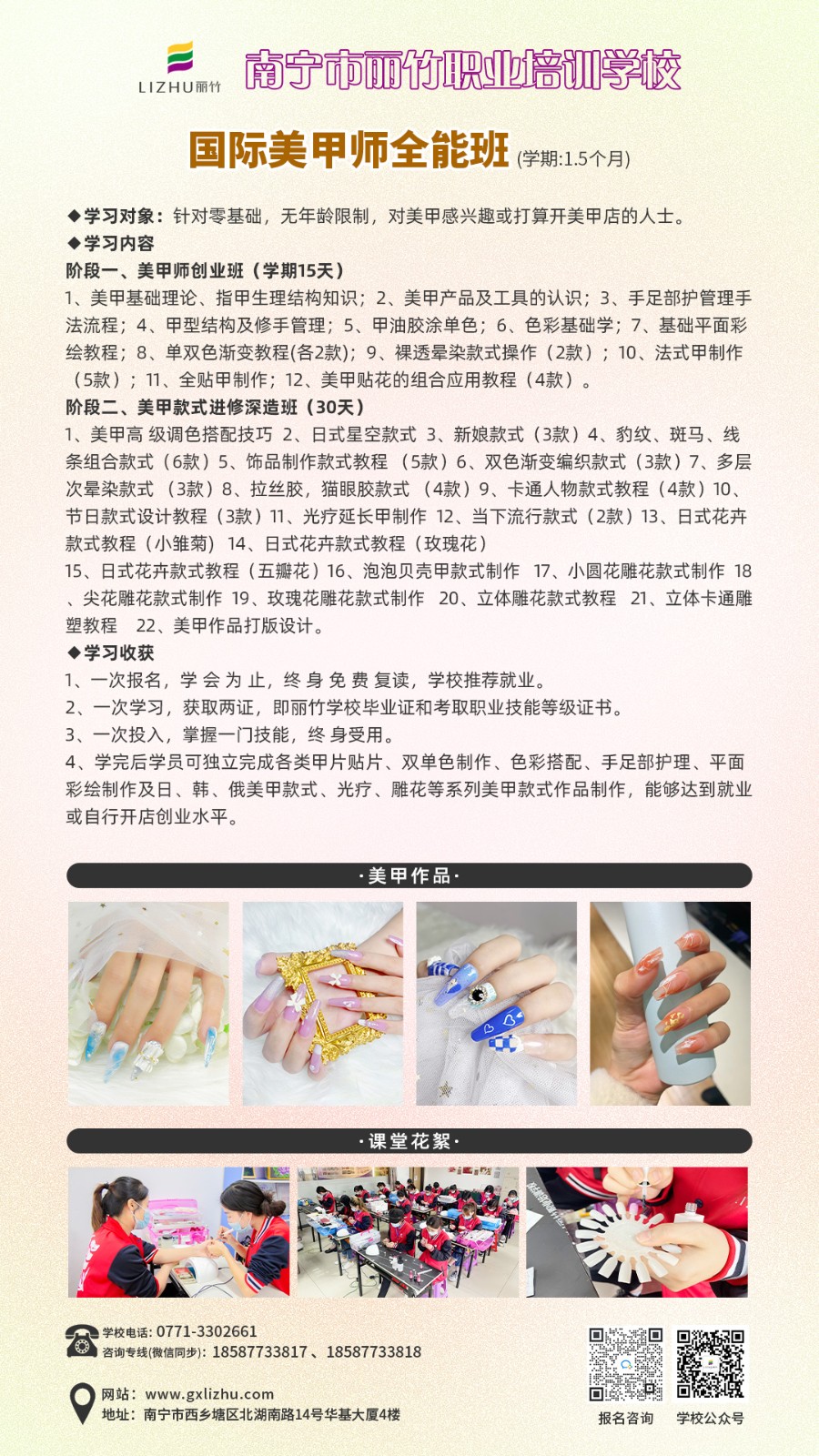 美甲款式不計其數(shù),但終究都是在扎實的美甲基礎(chǔ)上衍生而成。所以,無論你是想同步了解全新美甲資訊,還是對美甲技術(shù)感興趣,想自己動手繪制出屬于你的作品,廣西美甲造型學(xué)校(麗竹美甲學(xué)校)建議你可以先到學(xué)校參觀,試聽,體驗,滿意之后在報名。
